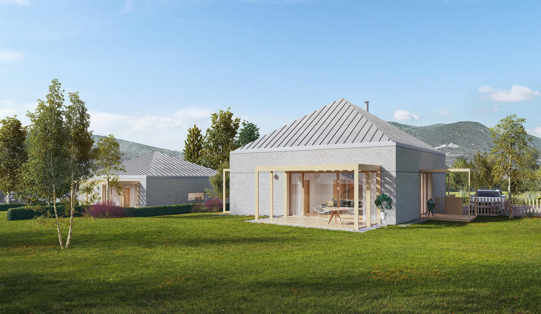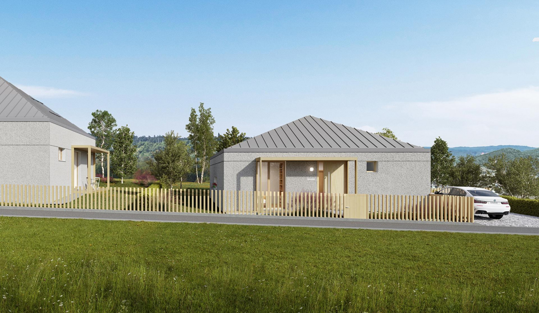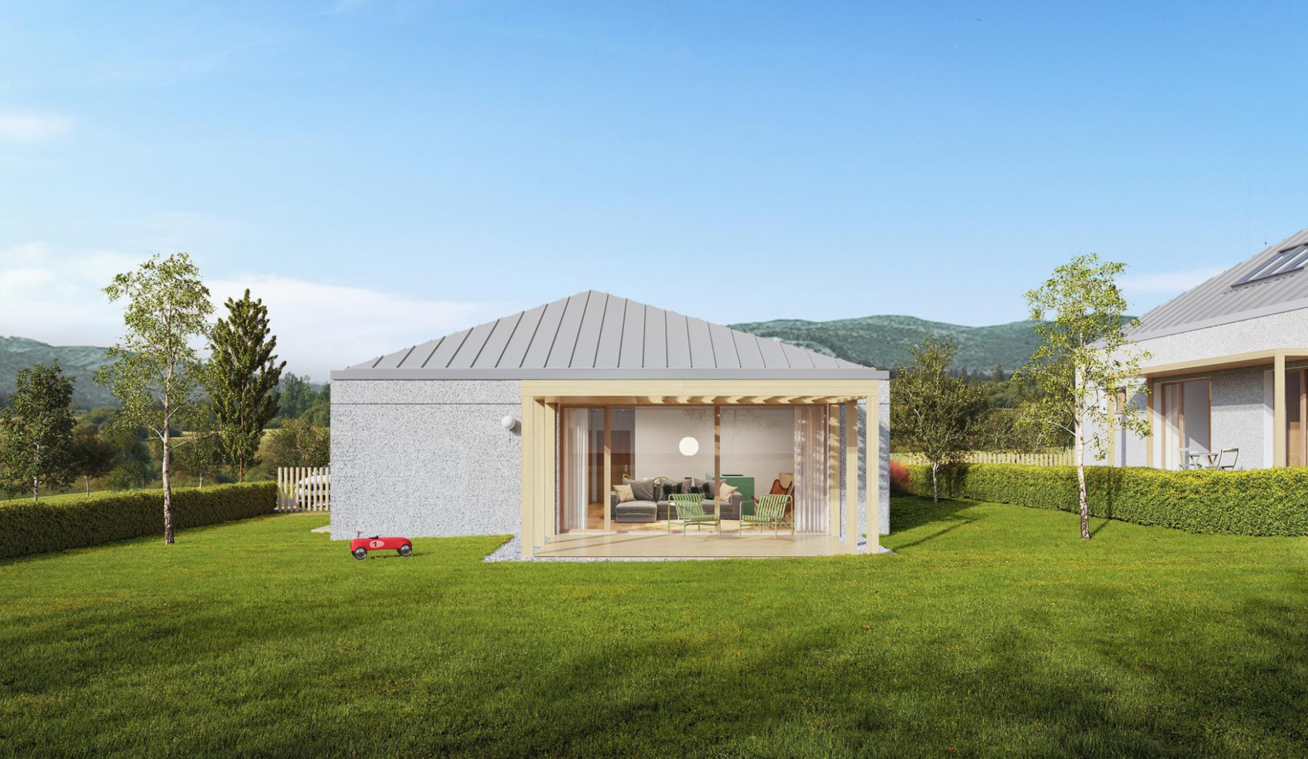 Ekonomický, minimalistický bungalov so stanovou strechou je vhodný pre 4 člennú rodinu. Výhodou dispozície je eliminácia chodieb, ktorá prenáša úžitkovú plochu do plochy obytnej. Výhodou je využitie výlezu do podkrovia, ktorý môže slúžiť ako príručný úložný priestor. Veľké okenné plochy v obývacej časti prepájajú interiér s exteriérom. Detské izby je možné dispozične spojiť alebo oddeliť priečkou prípadne vhodným nábytkovým prvkom. Hygienické zázemie tvorí samostatné wc a veľká spoločná kúpeľňa. Na fasáde je použitá brizolitová omietka, ktorá pôsobí prírodne a citlivo zapadá medzi existujúce domy.