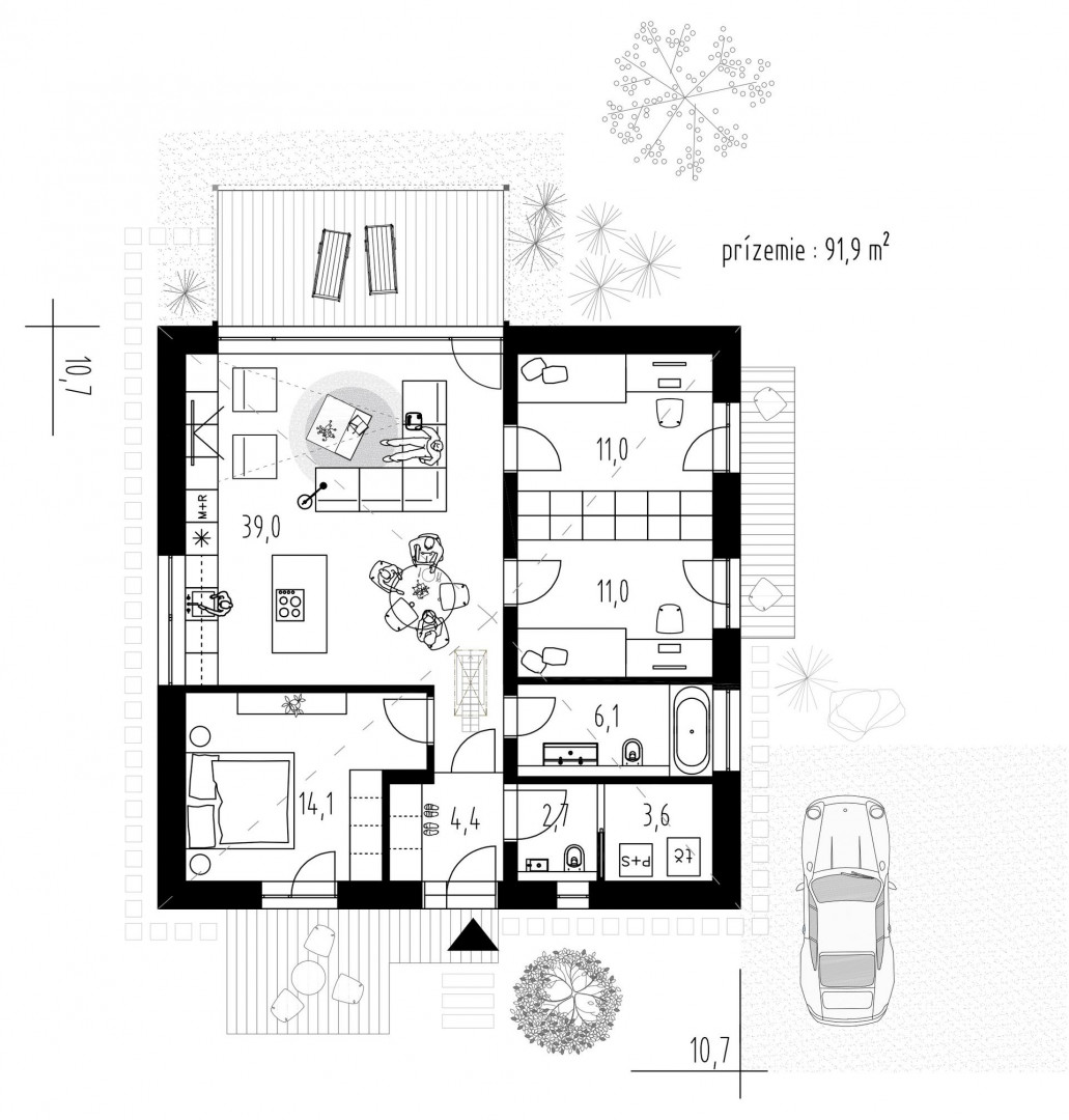 Projekt spĺňa všetky požiadavky na tichý, plnohodnotný rodinný život s výbornou dostupnosťou ku všetkým potrebám.