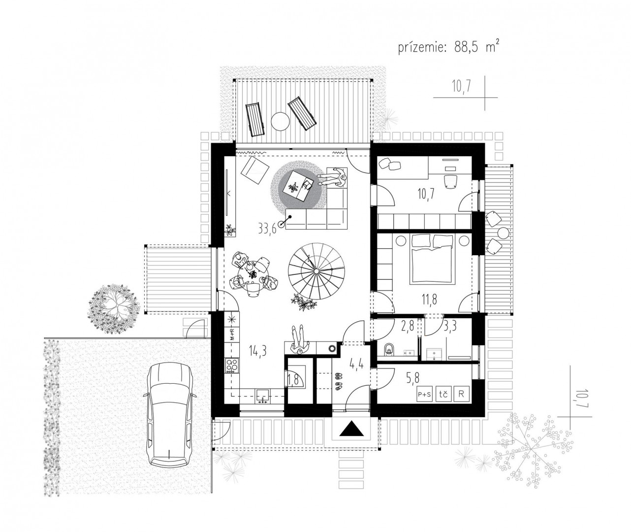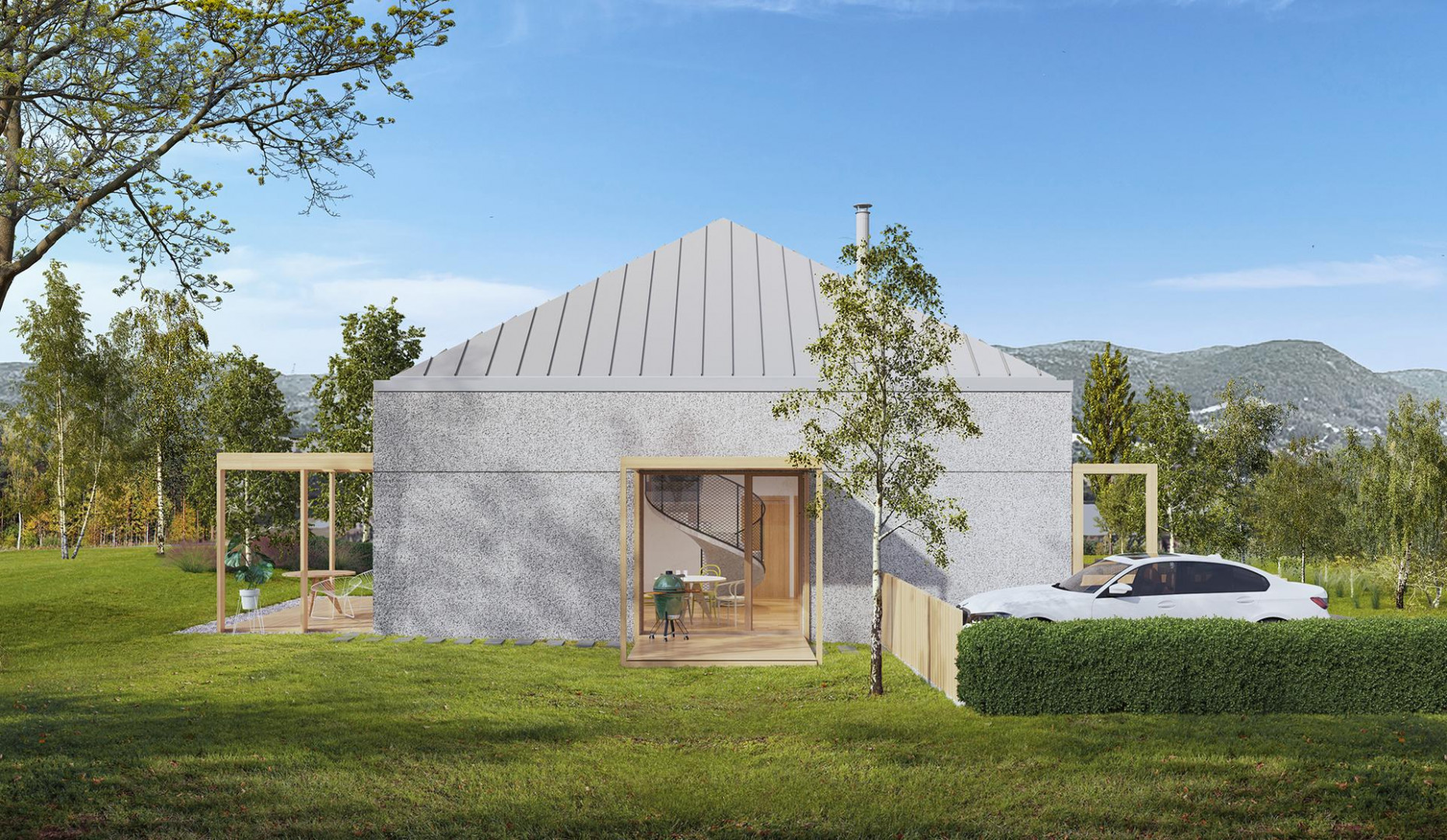 Podkrovný dom so stanovou strechou vhodný pre 4 člennú rodinu ponúka minimalistický dizajn s podčiarknutím elegancie. Fasáda domu s brizolitovou štruktúrou pôsobí prírodne a vkusne zapadá do novej alebo existujúcej urbánnej štruktúry. Dispozícia domu ponúka 2 nočné izby na prízemí, pričom jednu z izieb môžu využiť rodičia, deti alebo hostia. Podkrovie funguje ako samostatné zázemie s vlastnou hygienou pre tínedžera alebo rodičov. Výhodou otvorenej dennej časti je krb a dominantný akcent v podobe betónového točitého schodiska. Interiér tak pôsobí nadčasovo a veľmi vzdušne. Svetelnosti dopomáhajú aj veľkorysé okenné otvory. Dom je navrhovaný tak, aby spĺňal všetky potreby budúceho majiteľa.